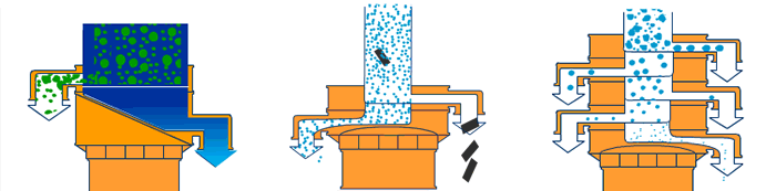 旋振篩,由單臺(tái)立式振動(dòng)電機(jī)作激振源,電機(jī)上、下兩端安裝有偏心重錘,將電機(jī)的旋轉(zhuǎn)運(yùn)動(dòng)轉(zhuǎn)變?yōu)樗健⒋怪?、傾斜的三次元運(yùn)動(dòng),再把這個(gè)運(yùn)動(dòng)傳遞給篩面,使物料在篩面上做外擴(kuò)漸開線運(yùn)動(dòng),故該系列振動(dòng)篩稱之為旋振動(dòng)篩。