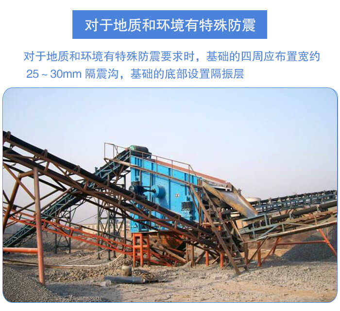 對于地質和環(huán)境有特殊防震要求時,基礎的四周應布置寬約 25~30mm 隔震溝,基礎的底部設置隔振層,基礎底部夯實之后,用水泥、煤渣、瀝青鋪設厚度約 200mm,在此隔振層上再澆灌混凝土。