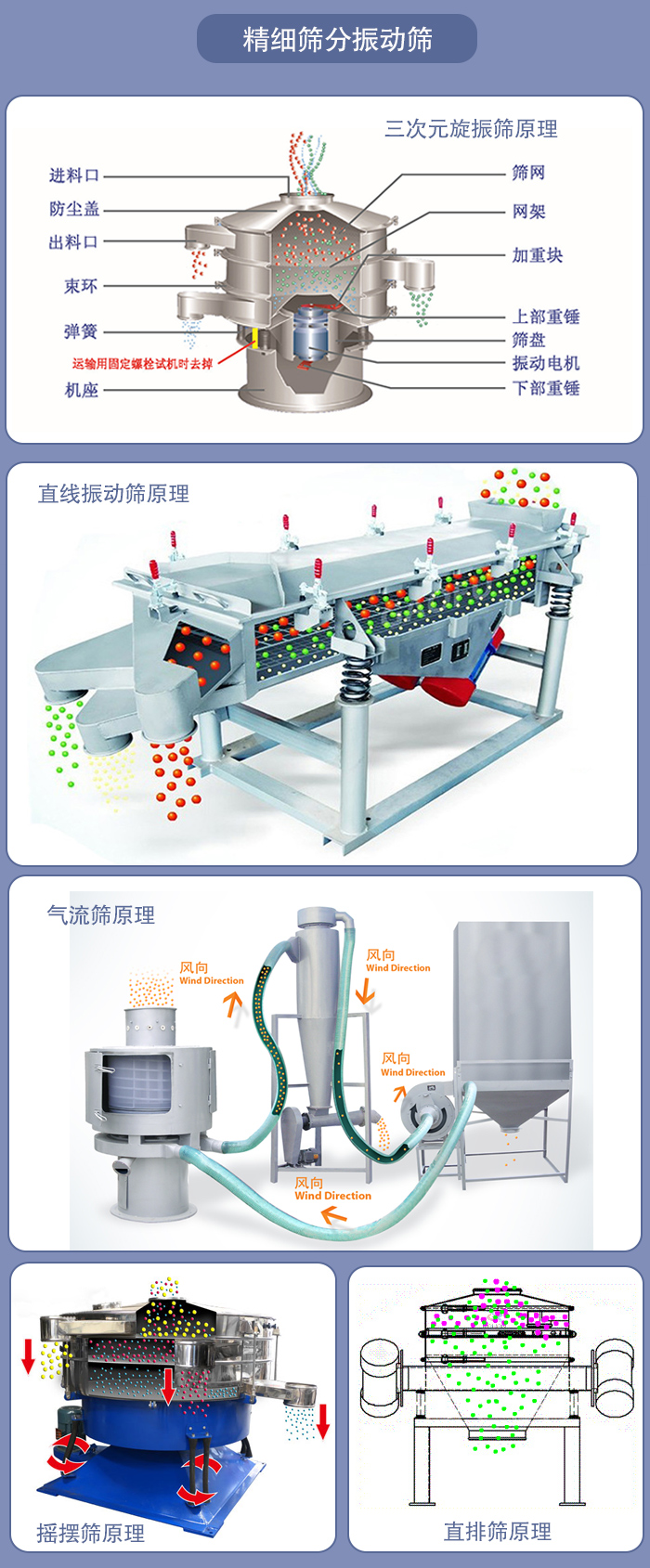 直排篩的原理是通過振動源的作用使物料在篩面做三維運動,這種運動方式可以使結(jié)塊物料散開,快速的通過篩網(wǎng)。精細(xì)物料直接由下部排出,雜物粗料則通過排渣出料口排出。