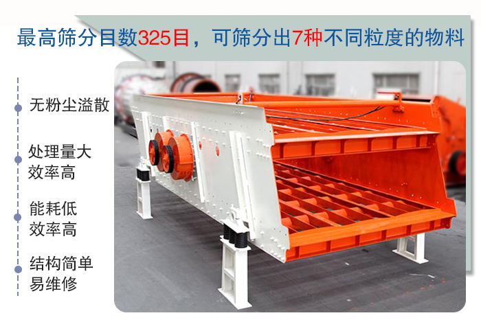 具有能耗低、效率高、結(jié)構(gòu)簡單、易維修、全封閉結(jié)構(gòu)、無粉塵溢散等特點。最高篩分目數(shù)325目,可篩分出7種不同粒度的物料。